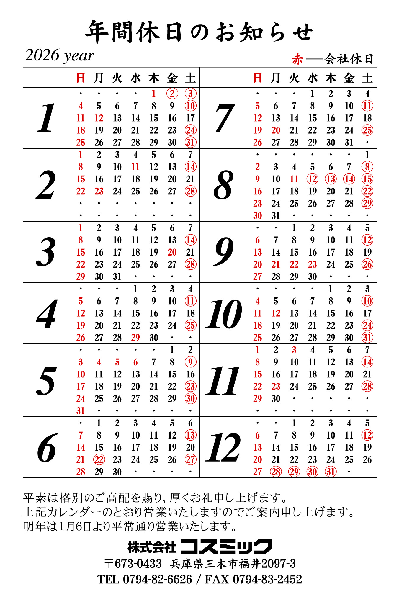2026営業日カレンダー